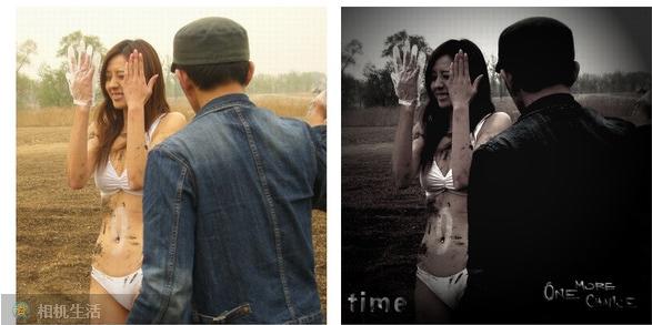 合模式为正片叠底,不透明度为60%,选择椭圆选框工具选区中间部分,按Ctrl + Alt + D羽化,数值为70,然后按两下Delete键删除,再打上文字,完成最终效果。