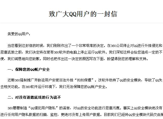 今日,腾讯与360的骂战升级,腾讯决定装有360软件用户将不能使用qq。