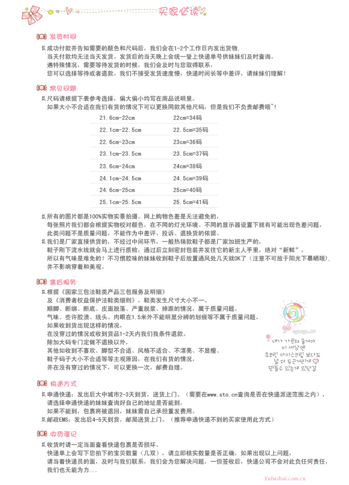 淘宝装修图片的说明:这张图片非常适合鞋类店铺直接放在你店铺宝贝详情页(商品描述页面)的底部作为买家必读,告诉买家你家的“发货时间”、“鞋码尺寸”、“售后说明”、“快递方式”和“收后提示”等信息。