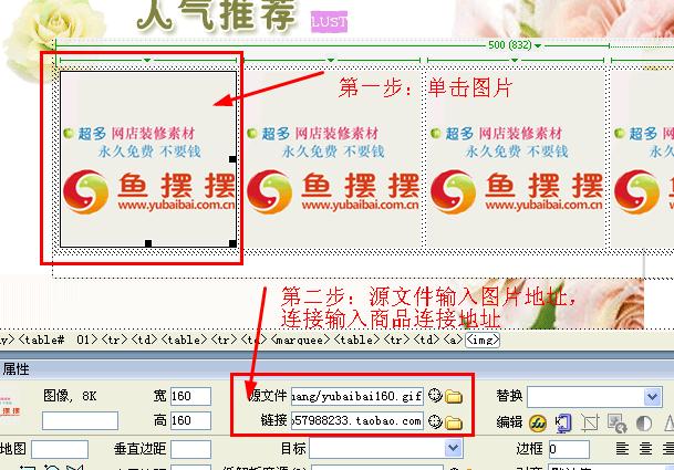 代码中http://shop57988233.taobao.com为连接地址,http://mb2.yubaibai.com.cn/tuiguang/yubaibai160.gif为图片地址。本模板提供了5个图片,因次你需要修改5个次。