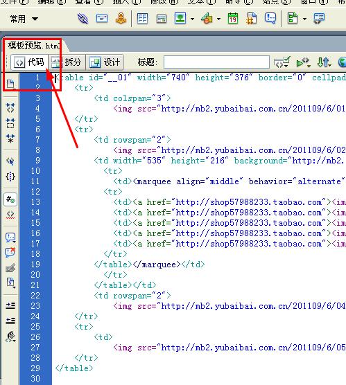 在所有的图片修改完毕后,单击《Dreamweaver》中的“源码”按钮,出现的代码即为修改后的模板安装代码