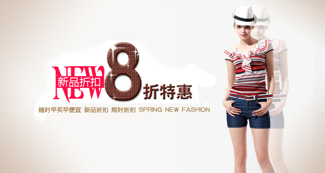 分享一款可通用的渐变背景淘宝海报图片素材,新品折扣8折特惠广告图片。该海报中的“新品折扣8折特惠”文字不可修改,其余的文字和两张模特背景均可以修改。注意底部的模特暗影由透明度来实现。