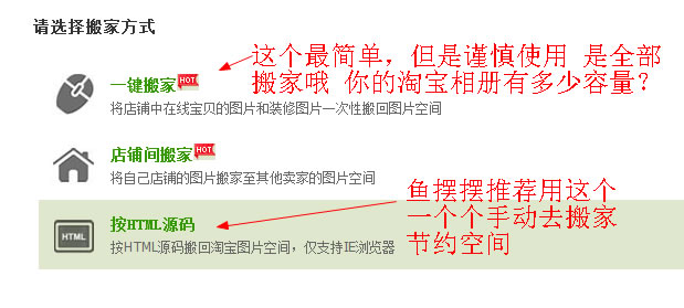“按html源码”搬家是我们推荐的,如果你的图片比较少,比如只是使用淘宝店铺装修模板,建议用这个。