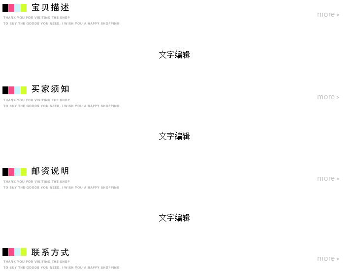 (2)如果你是付费版淘宝旺铺,建议将该宝贝描述模板分别安装,这样方便你日后更新和维护。为了方便大家使用,我们已经将模板分为3个模块,其中“更多推荐”建议安装在宝贝描述顶部的自定义模块,“联系方式”等模块安装在宝贝描述下方的自定义模块。