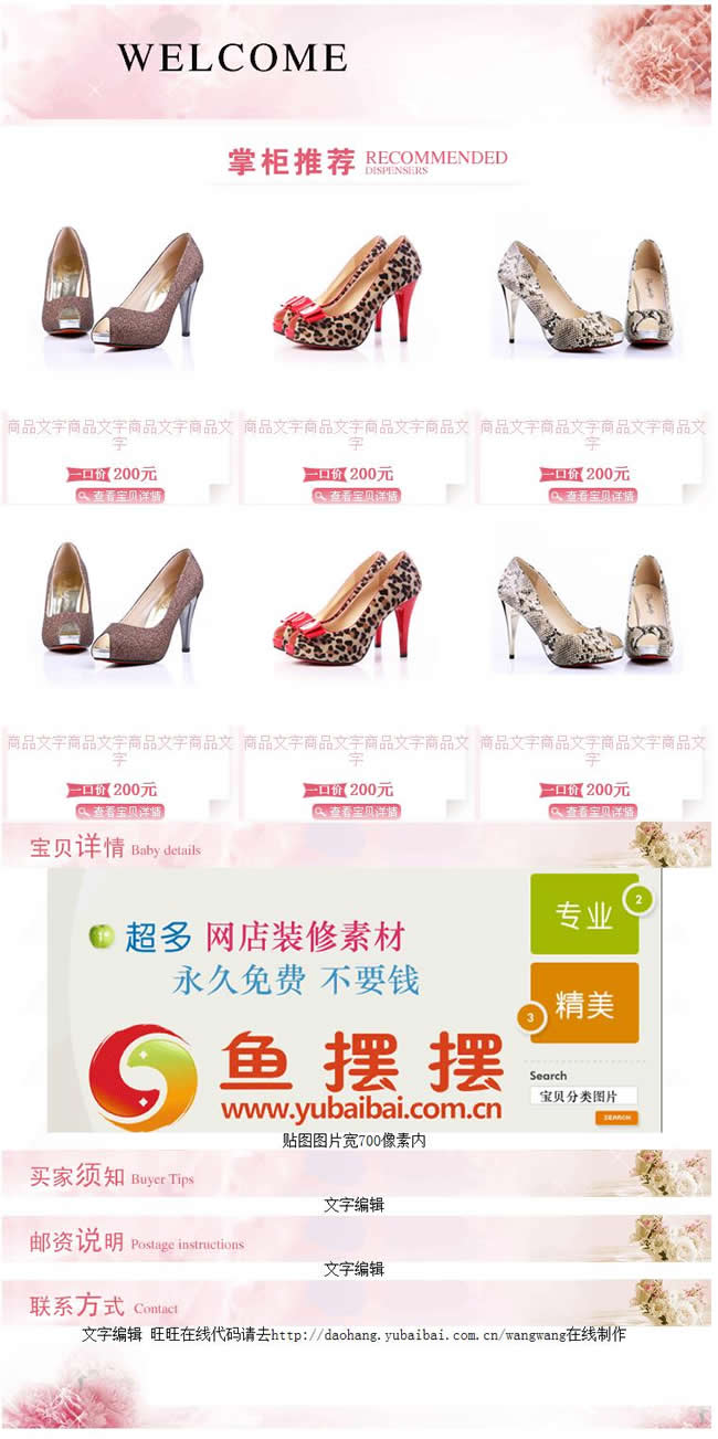 分享一款不错的玫瑰粉色缤纷色彩淘宝店铺宝贝描述模板,该模板包含了掌柜推荐、宝贝详情、买家须知、邮资说明、联系方式,为了方便大家日后更新方便,我们已经将模板分离成3个模块,建议大家在宝贝描述页面新建2个自定义模块,顶部放掌柜推荐,底部放买家须知等内容。中间就只用宝贝详情。