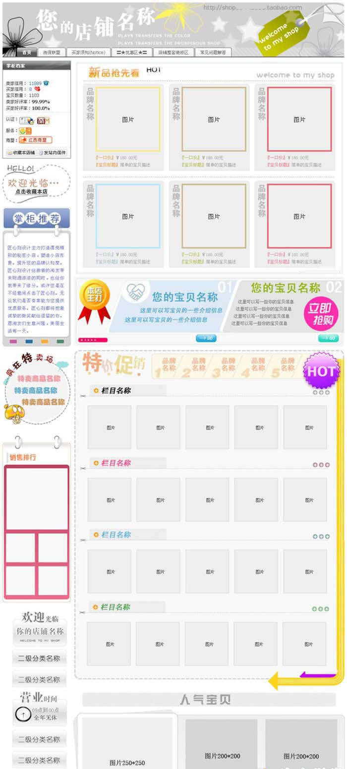 分享一套不错的全套免费的浅色通用淘宝模板:浅色通用淘宝装修模板QT0007。该全套模板包括了店招psd源文件、宝贝分类psd源文件、4个右侧程序模板、一个左侧收藏模板和左侧促销模板。该淘宝店铺装修模板的全套安装后的效果图如下:
