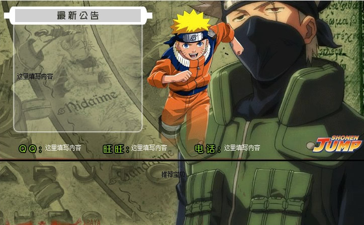 分享一套游戏类的淘宝店铺装修模板:淘宝店铺公告模板。该模板含最新公告、店铺联系模块(QQ、旺旺、电话)和推荐宝贝,模板含热门的动漫电影《火影》,非常适合网游类淘宝店铺使用。其预览效果如下: