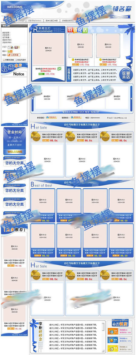 继续分享全套的淘宝店铺装修免费模板,该模板以蓝色为主色调,比较通用。包含了190像素宽左侧收藏模块、190像素宽左侧热销模块、950像素宽淘宝店招图片、和5个750像素宽的右侧促销模块。其简要预览截图如下: