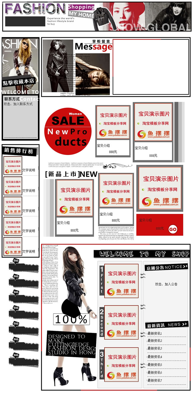模板中的店招图片和分类图片是空白图片,需要使用专业的图片软件如ps、fireworks等在图片上加字,或者前往鱼摆摆图片帮手http://123.yubaibai.com.cn上传图片后在线制作店招和宝贝分类。