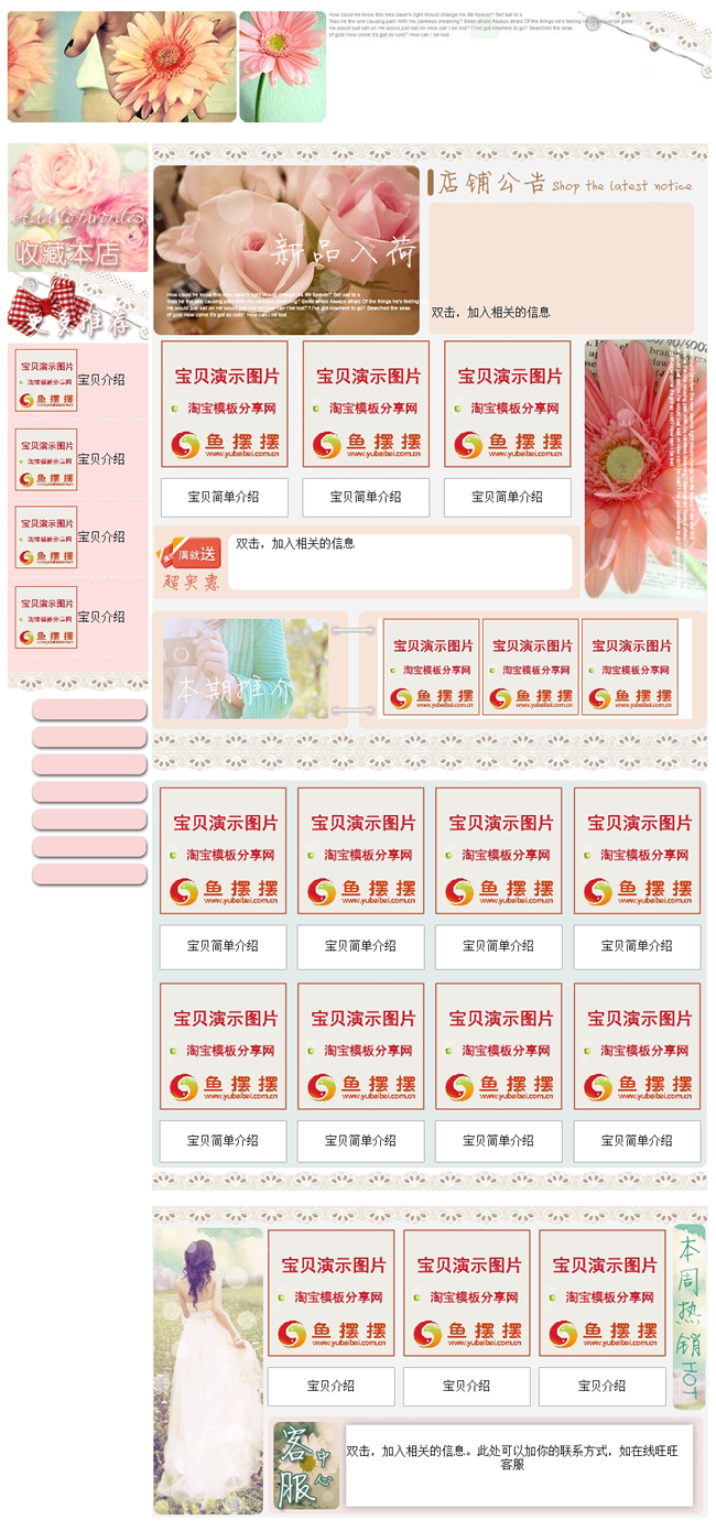 模板介绍:本淘宝免费模板包含了淘宝店招图片、左侧宝贝推荐模块、宝贝分类模块、上下滚动的店铺公告、以及右侧的推荐模块和客服中心。宝贝分类和店招图片即可以前往鱼摆摆图片帮手快速简易制作,也可以使用fireworks等图片软件自行修改。