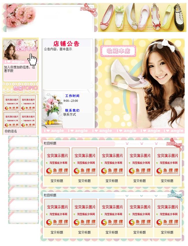 鱼摆摆www.yubaibai.com.cn :分享一套完整的甜美风格淘宝淘宝店铺装修免费模板,该淘宝装修模板的店招以女鞋为背景,作为女鞋店淘宝店铺非常合适。下面是该模板的预览截图: