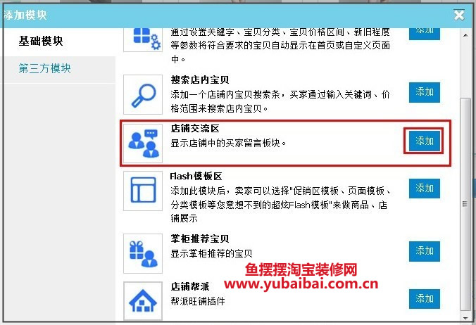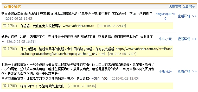 鱼摆摆淘宝装修网www.yubaibai.com.cn:淘宝店铺里的店铺交流区是一个买家、卖家自由交流的平台,和网站上的留言性质类似,用于买卖双方的沟通互动。比淘宝旺旺留言的好处在与留言不会丢失,而且大家都可以看到。
