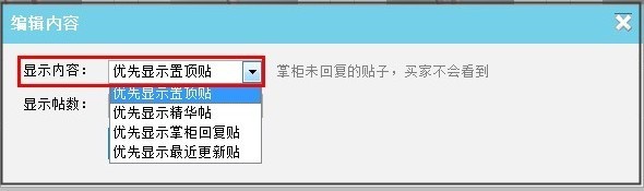 5)可以看到有“显示内容”和“显示帖数”两个按钮,卖家可以自行选择这两个选项,选择完毕,回到导航栏,点击“发布”按钮,再点击“查看我的店铺”按钮,便可在自己店铺首页对店铺交流区进行各项操作。