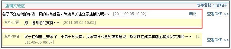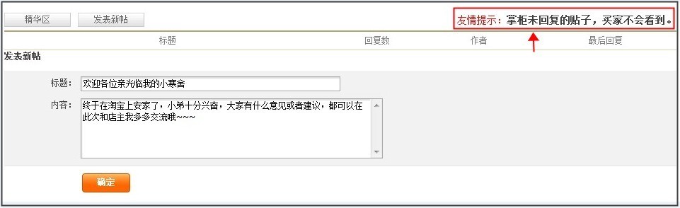 (但,这里需要强调的是,买家的发帖必须经过掌柜回复才能展现在店铺前台,否则只有掌柜自己可以看见,店铺前台则不展示哦~~)