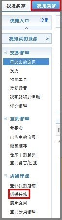 第一步:登陆淘宝“我是卖家”后台,点击“店铺装修”(如下图所示)或者进入装修系统,http://design.taobao.com(需登录)
