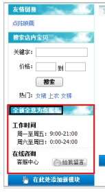这个淘宝客服中心模块是新版淘宝旺铺里新加的淘宝装修模板,这个模板的好处是不用懂代码,简单几下就添加好了店铺工作时间与旺旺在线咨询的图标。不过界面很简洁,更多高级版的淘宝客服中心模板见http://www.yubaibai.com.cn/html/kefumuban/,下面是淘宝官方淘宝客服中心的效果如下: