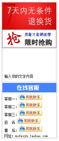 该淘宝旺旺客服模板宽度为190像素,为淘宝左侧免费模板。模板顶部添加了一张“7天无条件退换货”提示图片。为了便于大家修改本模板,我们在添加了演示的旺旺在线图标。大家下载模板后,只要将我们的演示旺旺代码<img src="http://2www.yubaibai.com.cn/cy/wwd.gif" width="77" height="19" border="0" alt=""/>替换成自己的旺旺在线代码即可。