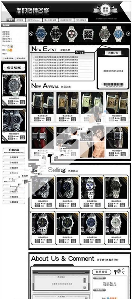这款黑白色系淘宝店铺装修免费模板适合手表钟表淘宝店铺使用,如果你喜欢这款模板的风格,也可以作为其他类型的店铺使用。模板里的手表图片均可自由替换成你自己的商品。其预览截图如下: