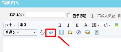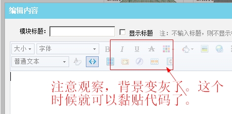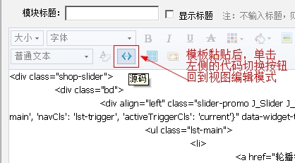 (4)自定义内容区打开后,默认是视图模式,需要单击如下图所标的“代码模式”切换按钮,待该位置的工具图标按钮变为灰色,“代码模式”切换按钮四周有小框时,黏贴你选择的轮播代码(代码见本文顶部第一步,自行下载)