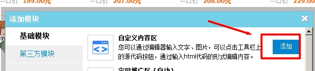 (1)登录淘宝,进入店铺装修后台,在右侧最小面,单击“添加模块”