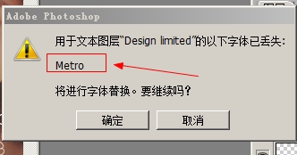 图片中黄色警告小三角就表示该图层缺少字体,双击该图层,会弹出警告框。警告框中的“Metro”就是字体的名称。这个时候,不要点确定,而是点取消。不然替换后,字体就变了。