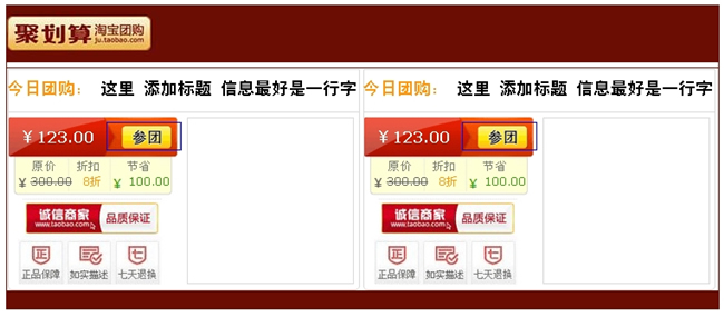 分享一份安装在淘宝右侧模块的750宽商城红淘宝聚划算模板代码,该模板可左右各放一个商品。其预览截图如下: