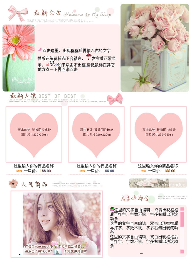 分享一份唯美花朵淘宝右侧模板代码,该模板包含了上下滚动的店铺公告、最新推荐、人气商品和店主碎念模块。该模板适合一些包包、鞋子、服装、饰品、居家日用等淘宝店铺使用,其预览截图如下: