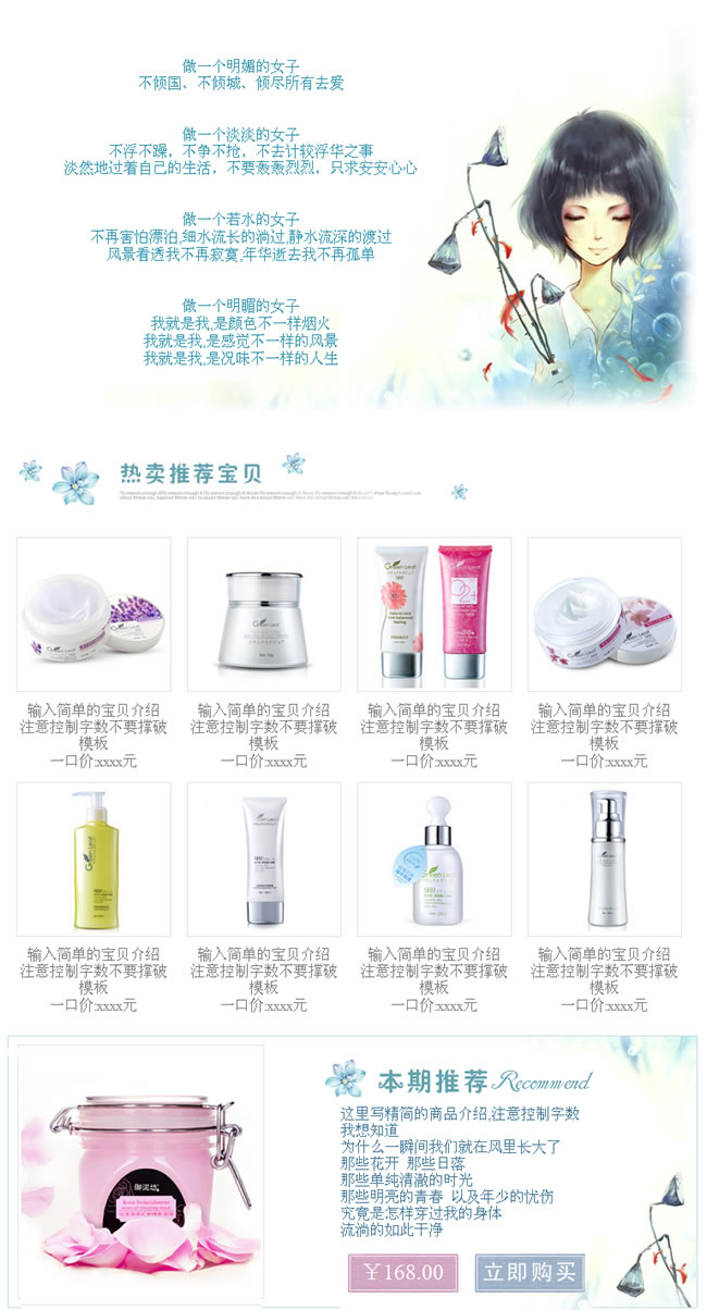 分享一份婉约唯美淘宝化妆品服饰店铺淘宝右侧模板代码,该模板顶部写了一首不错的词,再配了一副小清新的美女图片。预览效果如下: