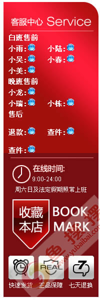 分享一份宽度为190,安装在淘宝店铺左侧自定义模块里的商城红淘宝旺旺客服模板代码。该模板预览效果如下: