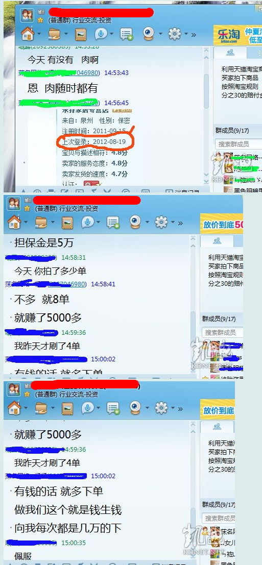最常见的方法是在商家未发货的情况下,申请退货赔偿。这源于淘宝的硬性规定:只需在商家发货之前申请缺货退款,就可得到商家赔款30%,我朋友历尽各种考验加入退款核心群的聊天记录截图几天后朋友告诉我,他全整明白了,“退款师”操作就是寻找那些连续几天没有人在线维护的店家,然后就瞄准对方天猫保证金金额不停“下注”(下订单),然后72小时不发货就提起退款维权要求,不但购货款如数退回,而且凭空赚了30%的违约金,虽然有最高500元的违约金限制,需要不停地下订单,但的确是一本万利的好买卖。甚至有一个天猫卖家,保证金几天内就已经被要求退货维权弄完了的。现在的淘宝升级了,退款师们也跟的升级了,他们利用自己自制的软件可以搜出长期不在线的店铺,各位天猫店家请注意,当你们淡季时想歇业请将宝贝下架放入仓库。
