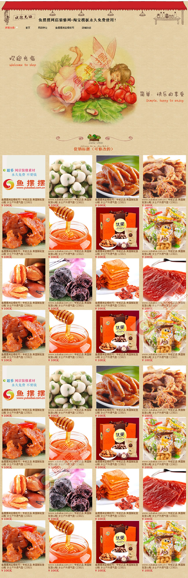 本淘宝简单、漂亮,风格适合淘宝里卖零食、美食、地方特产、坚果、牛肉干等食品类店铺使用。模板安装顺序是背景设置、店招安装、导航条css安装、美女大海报安装和促销推荐模板安装。