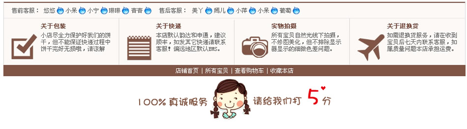 该模板中包含了淘宝旺旺售前客服、售后客服,以及对包装、快递、实物拍摄和退换货购物须知,以及100%真诚服务,请给5分好评的温馨提示图片。