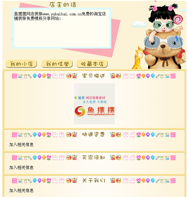 分享一份比较适合淘宝母婴、玩具、文具等店铺的俏皮可爱风格淘宝宝贝描述模板代码,其预览截图如下:
