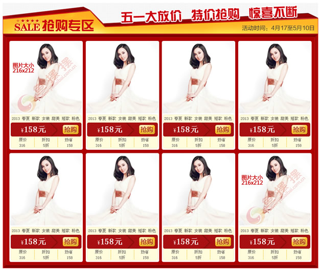 分享一份红色通用的淘宝51劳动节促销模板,该模板适合有950自定义模块的旺铺专业版、淘宝商城、旧版淘宝拓展版店铺使用。模板中的演示图片大小为216x212,其装修效果图如下: