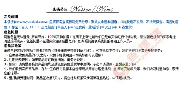 分享一份非常漂亮简单的淘宝750店铺公告模板代码,模板里有发货说明、色差问题、退换货政策这些店铺公告说明。其预览截图如下:
