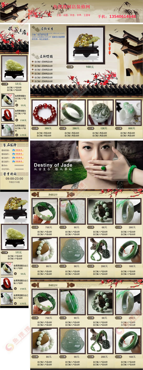 分享一份翡翠玉石玉器手镯店铺淘装修宝模板,该模板适合淘宝扶植版店铺使用(2012年及以前的老版淘宝店铺),该淘宝店铺装修模板含淘宝店招、宝贝分类图片、190左侧模板代码、750右侧模板代码。