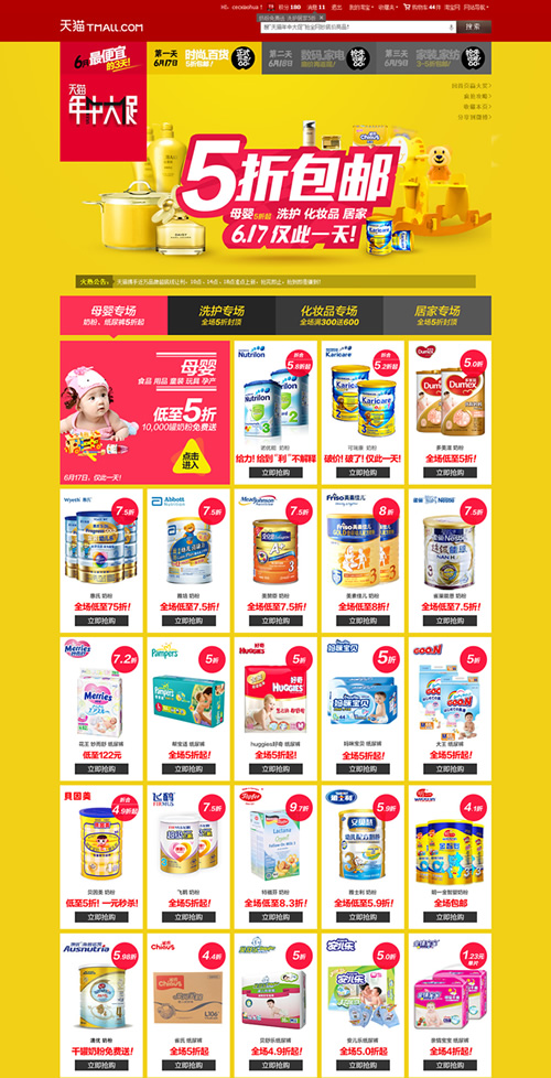 6月17日、6月18日、6月19日三天,淘宝年中大促销活动开始了。淘宝年中大促销活动网页地址是:http://dacu.tmall.com/,淘宝年中大促销活动3-5折起包邮,还有红包可拿。有需要的朋友可以囤货了。呵呵,站长鱼摆摆自己马上要装修自己的新房,迎接宝宝的到来,购物车里已经满满了。