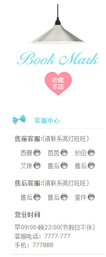 分享一份190宽淘宝左侧蓝色简约漂亮的淘宝旺旺客服模板代码,该模板适合安装在店铺左侧190自定义模块。该淘宝旺旺客服模板含淘宝收藏本店、售前售后客服旺旺、店铺营业时间。
