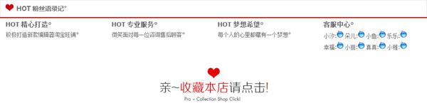 分析仪漂亮的简约唯美桃心950宽淘宝店铺页尾模板,模板中的“hot粉丝语录记、精心打造、专业服务、梦想希望”等文字均可以修改为你自己的。模板右侧含旺旺在线客服模块,底部有收藏本店模块。