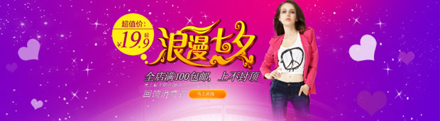 分享一份七夕节时尚紫色1920宽全屏七夕淘宝海报,这款是1920px宽的海报素材,含psd源文件。你可以自行编辑,也可裁剪为950、750宽的海报图,安装到你的淘宝店铺里。海报里的模特、超值价、全店满100包邮等信息均可以使用Photoshop图片处理软件来编辑。
