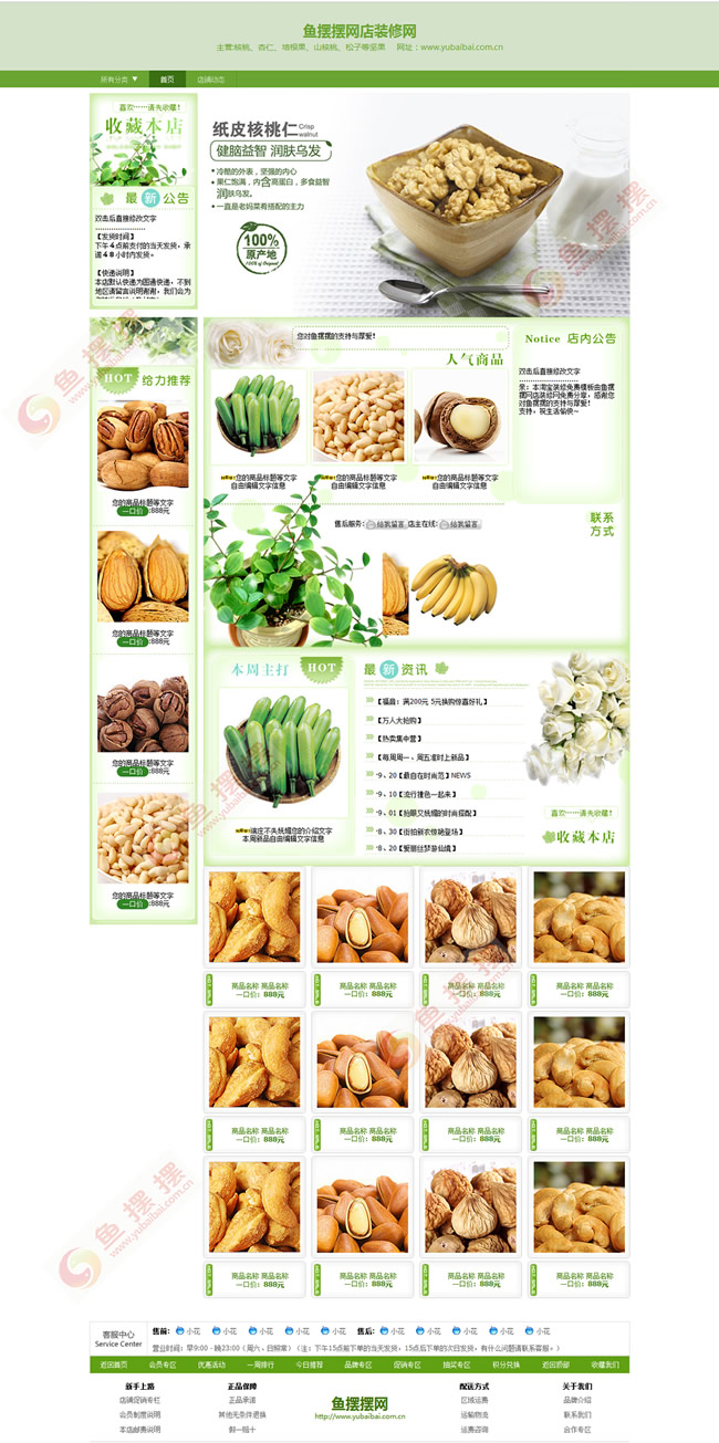 整理淘宝装修模板,发现一份绿色淘宝坚果干果零食店淘宝装修模板比较不错。鱼摆摆稍微修改了一下,现分享给大家。该模板构成简单,导航条css采用草绿色配色默认设置,无需单独设置。模板有店招代码、页头背景、190左侧模板、750右侧模板和950的店铺尾部说明模板构成。