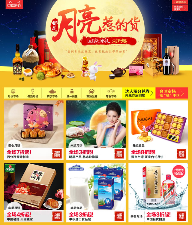 鱼摆摆浏览了2013年淘宝中秋节活动天猫主会场网页,搞活动的商品还是挺多,价格也非常实在。元祖月饼全场8折起,53度的飞天茅台酒更是低至928元一瓶,两瓶装的茅台王子酒只卖199元,另外还有超多搞特价的红酒、咖啡、巧克力、营养保健品,准备上门拜见岳父、岳母,回家孝敬父母,合家团圆聚餐团聚可以狠狠采购了。