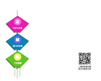 背景固定图片素材为含100%正品、满100包邮、7天退换三个店铺品质说明,以及右下角的二维码图片。
