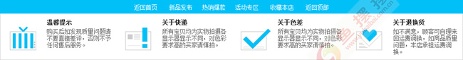 分享一份简单的天蓝色淘宝店铺尾部模板代码,该店铺底部说明模板代码的头部是常用的文字链接区,下面是“温馨提示”、“关于快递”、“关于色差”、“关于退换货”四个详细说明文字。文字可修改。