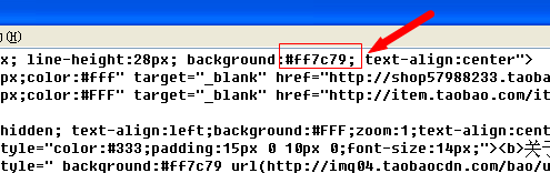 (1)模板代码的顶部,找到“ line-height:28px; background:#ff7c79; ”,将其中的#ff7c79颜色代码修改为自己店铺的颜色。