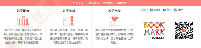另外,很多店铺配色各异,白色、黑色、紫色、橙色、绿色等等,为了适用自己的店铺,亲可以在模板代码的顶部,找到“ line-height:28px; background:#ff7c79; ”,将其中的#ff7c79颜色代码修改为自己店铺的颜色。