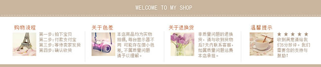 说明:本素材为图片,里面的购物流程、关于色差、关于退换货、温馨提示均不可修改。这些都是通用描述,大家下载后,直接放在 店铺底部的模块里即可。