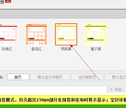 左上角“装修”——“样式管理”--“样式编辑”-“选择配色”,设置配色为“明亮黄”