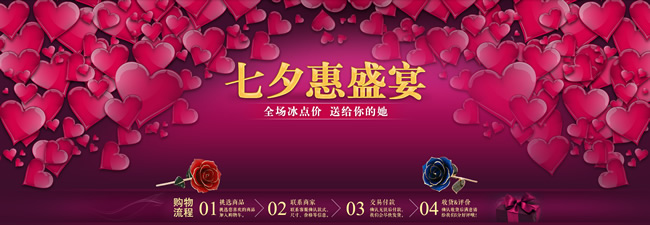 很快就是七夕节了,鱼摆摆将分享大量淘宝七夕素材哦。今天分享的是一份1920px全屏效果的桃心淘宝七夕海报图片哦。如果亲会ps,建议在两朵玫瑰之间放上亲店铺的七夕促销宝贝哦。