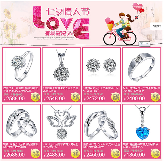 分享一份宽为750,主题为“七夕情人节,有爱就购了”的淘宝七夕促销模板。模板中的商品图大小为175x175.